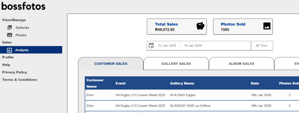 Firstly, you can have an overview of your total sales and which customers have purchased from you. In the menu go to “analysis” and you can view sales by customer, gallery, album and event. From either the customer tab or the gallery tab you can see which galleries have had sales.